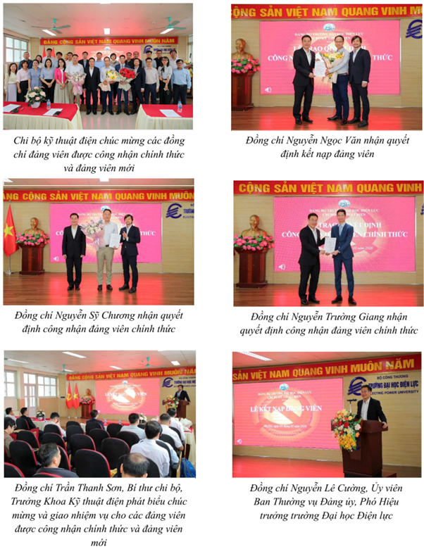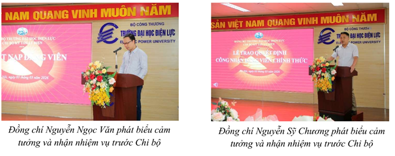 Tại buổi sinh hoạt, Chi bộ đã trang trọng tổ chức Lễ kết nạp đảng viên mới cho quần chúng Nguyễn Ngọc Văn sau quá trình rèn luyện, phấn đấu nghiêm túc và đủ điều kiện theo quy định của Điều lệ Đảng. Đồng thời, Chi bộ công bố và trao Quyết định công nhận đảng viên chính thức cho hai đồng chí đảng viên dự bị Nguyễn Sỹ Chương và Nguyễn Trường Giang. Trong không khí trang nghiêm, các đồng chí đã thực hiện nghi thức tuyên thệ, phát biểu cảm tưởng và nhận nhiệm vụ trước Chi bộ, thể hiện quyết tâm tiếp tục tu dưỡng, rèn luyện, hoàn thành tốt nhiệm vụ của người đảng viên.
