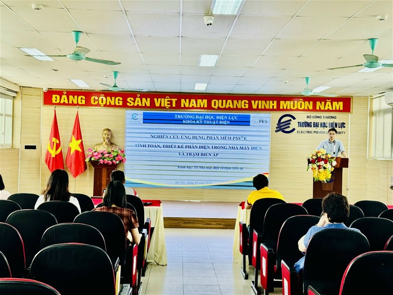 Chiều ngày 03/4/2026, tại hội trường M, Khoa Kỹ thuật điện – Trường Đại học Điện lực đã tổ chức seminar chuyên môn với chủ đề: “Nghiên cứu ứng dụng phần mềm PSS/E trong tính toán và thiết kế phần điện nhà máy điện, trạm biến áp”, do ThS. Phùng Thị Thanh Mai trình bày, với sự tham gia của các giảng viên trong khoa.